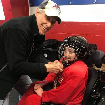 2. Youngster with downs syndrome was able to be pushed in a sled, and shot hockey pucks with his brother.